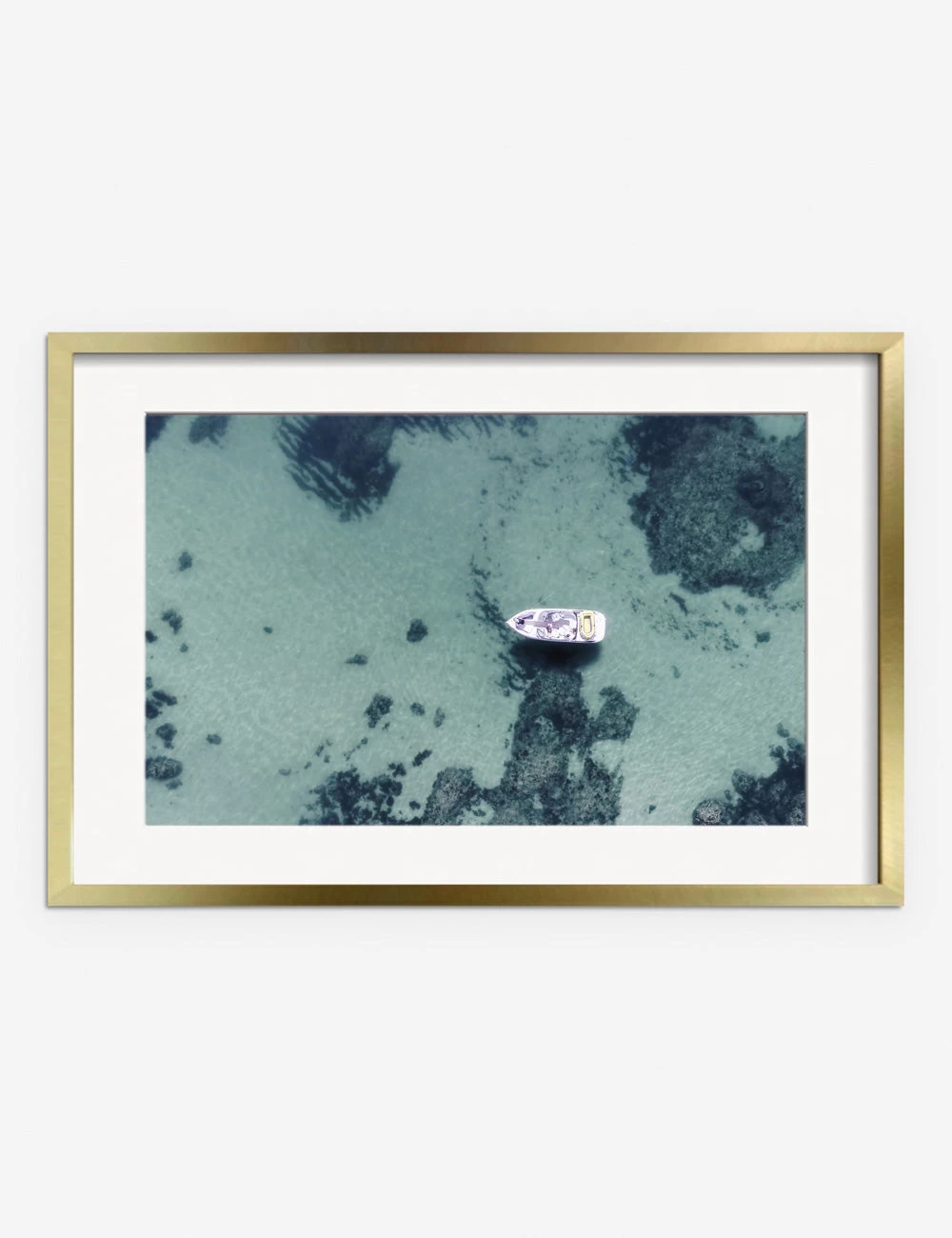 Awash in sunlit blue-green hues, this coastal photography wall art print features a captivating aerial view of a boat suspended on shallow waters. Bring a refreshing vibrancy to your wall decor with this seascape scene, arresting in its stillness yet evocative of a gentle lapping motion.