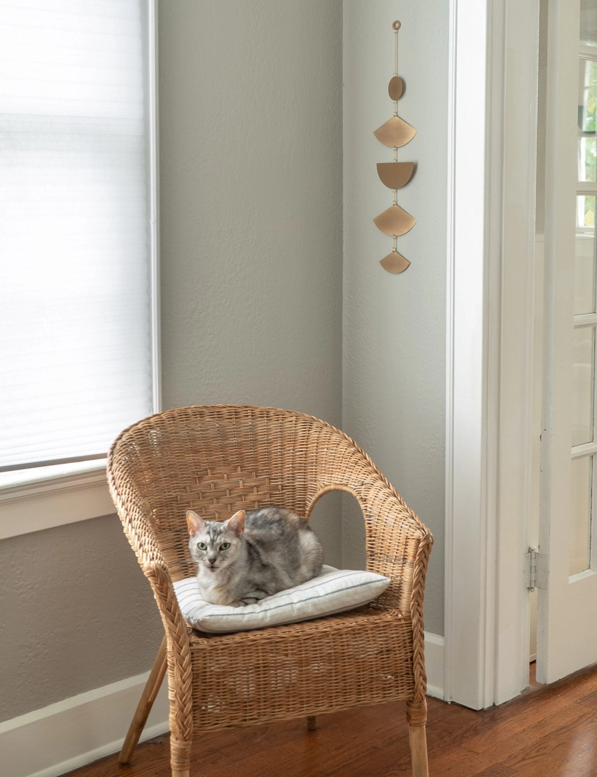 A versatile piece of wall decor, this linear wall hanging mixes simple geometric shapes for an easy-to-love look in any room. Strung on a single chain, this metal wall hanging brings a sense of playful balance to your home.
