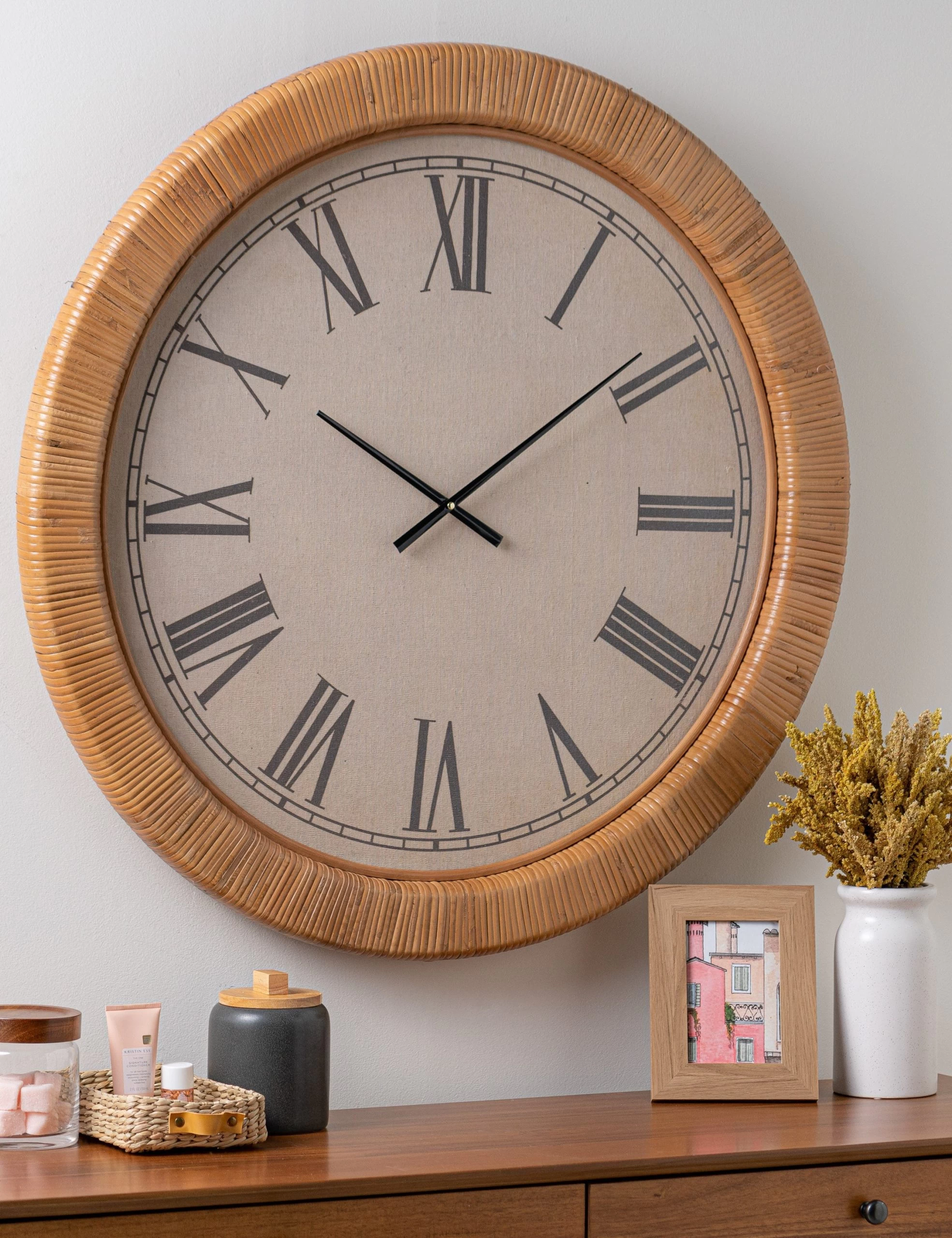 Natural materials bring a bit of organic warmth to this classic wall clock. The rattan-wrapped frame offers a charming touch of texture while roman numerals fashion the face with a timeless look set for transitional appeal.