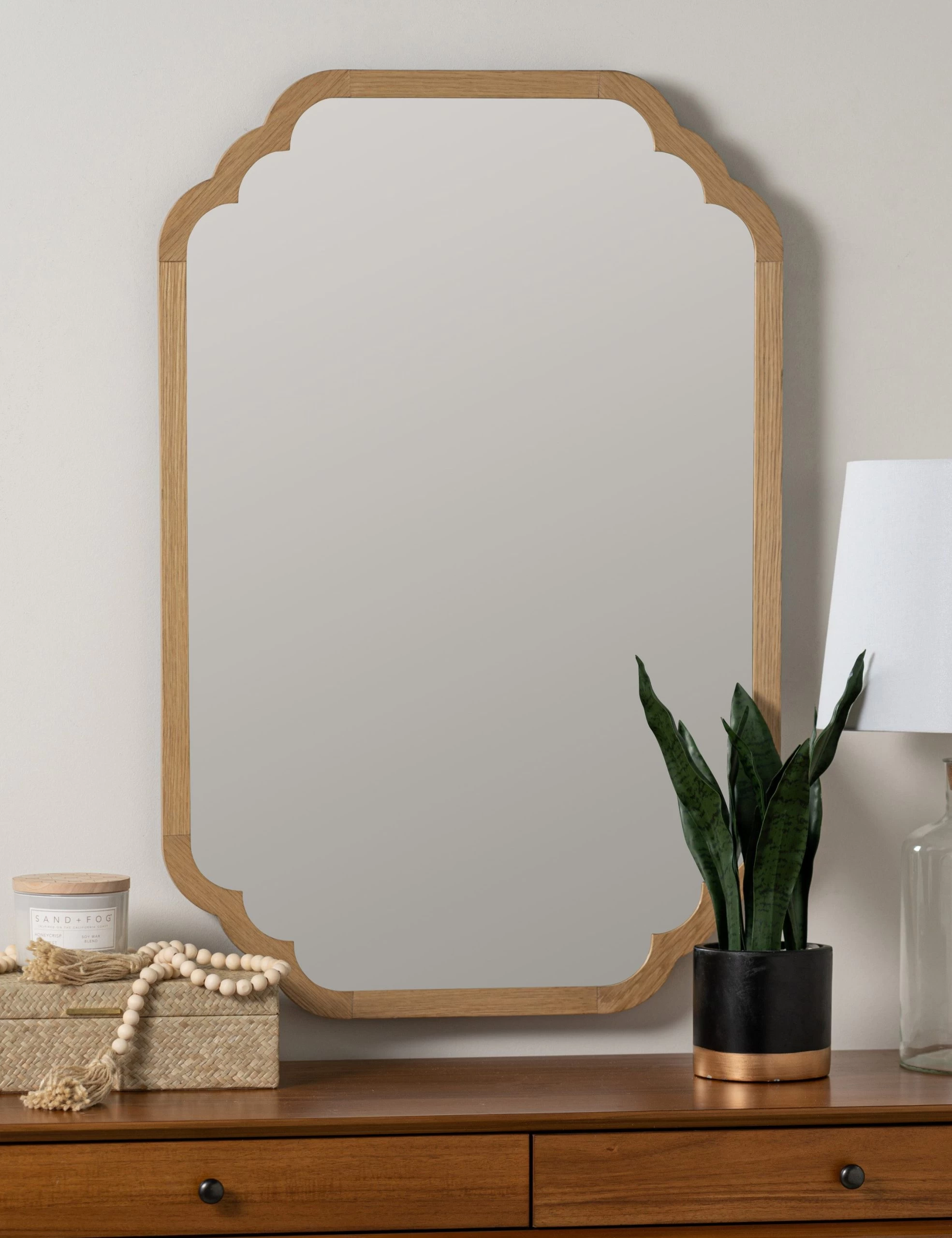 Effortlessly chic with a timeless charm—the Dandridge mirror is set for a transitional home design. The scalloped corners fashion a distinctive frame, offering warmth and splendor in a natural wood finish. Whether refining your lounge or augmenting light in a small-space design, this decorative mirror is the perfect touch.
