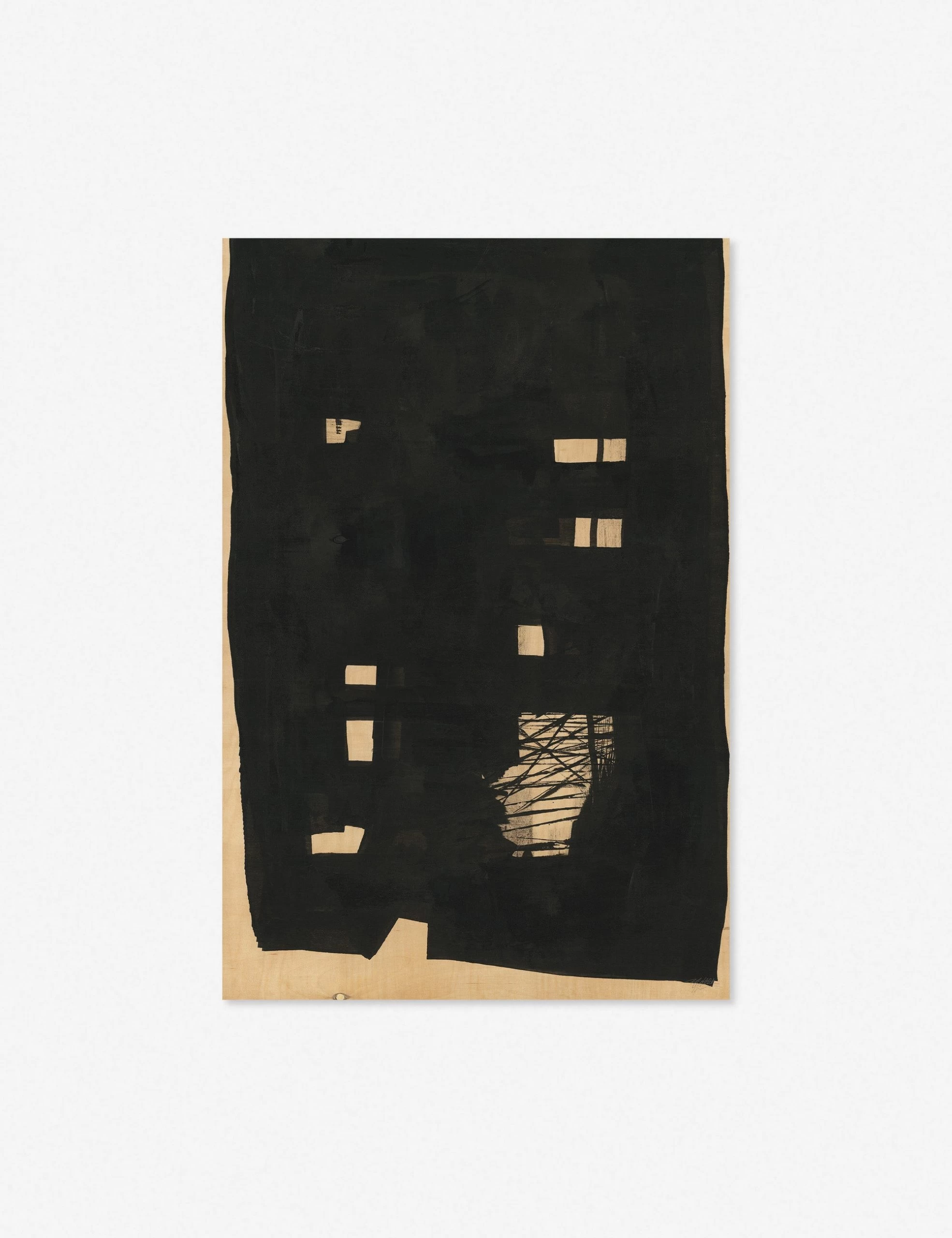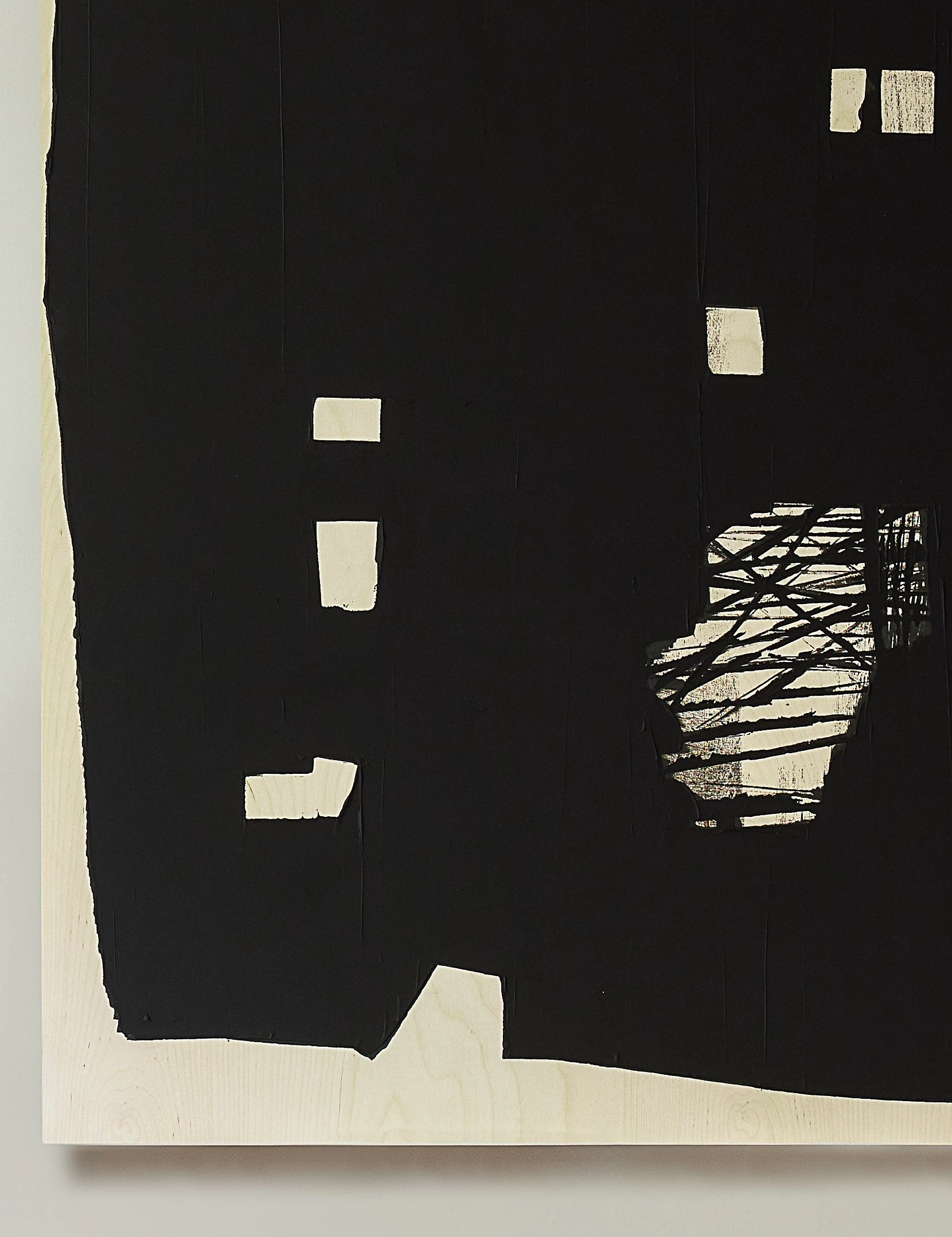 A minimalist composition offers visual impact in this abstract wall artwork by contrasting a dominant black form against the natural wood grain backdrop. Each piece in the Davao series is created by applying giclée printing to a birchwood plank and then embellished by hand to offer a striking, modern element for a gallery art wall or standalone feature piece.
