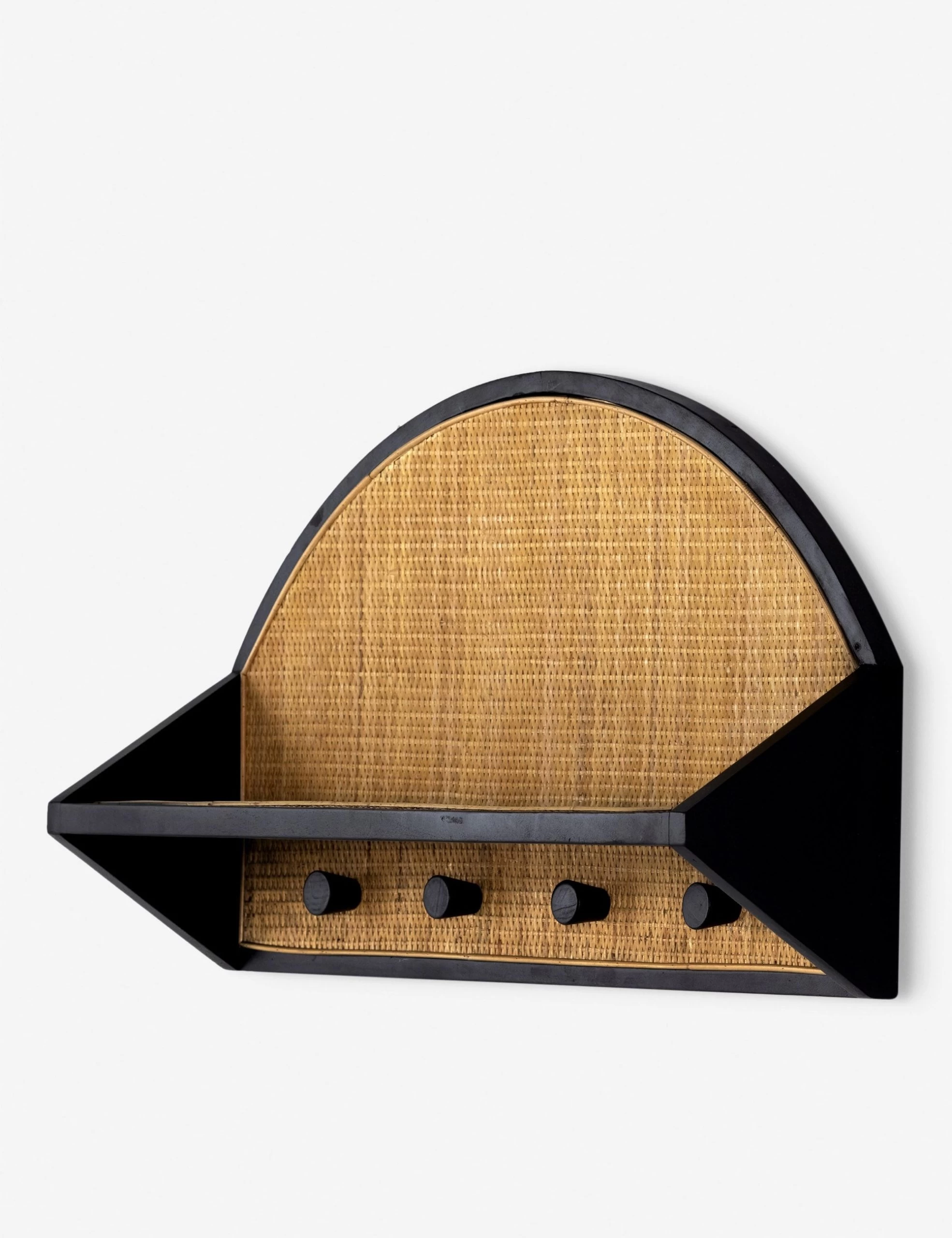 Bring a layer of natural texture into an entryway with this shelf made from black-finished Sungkai wood and woven cane paneling. This wall-mountable shelf featuring four hooks is a practical, organic touch for a functional space.