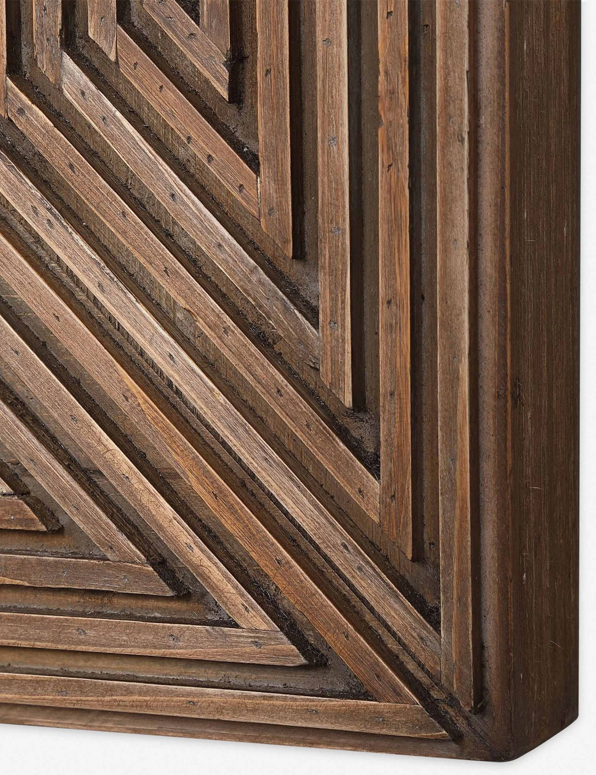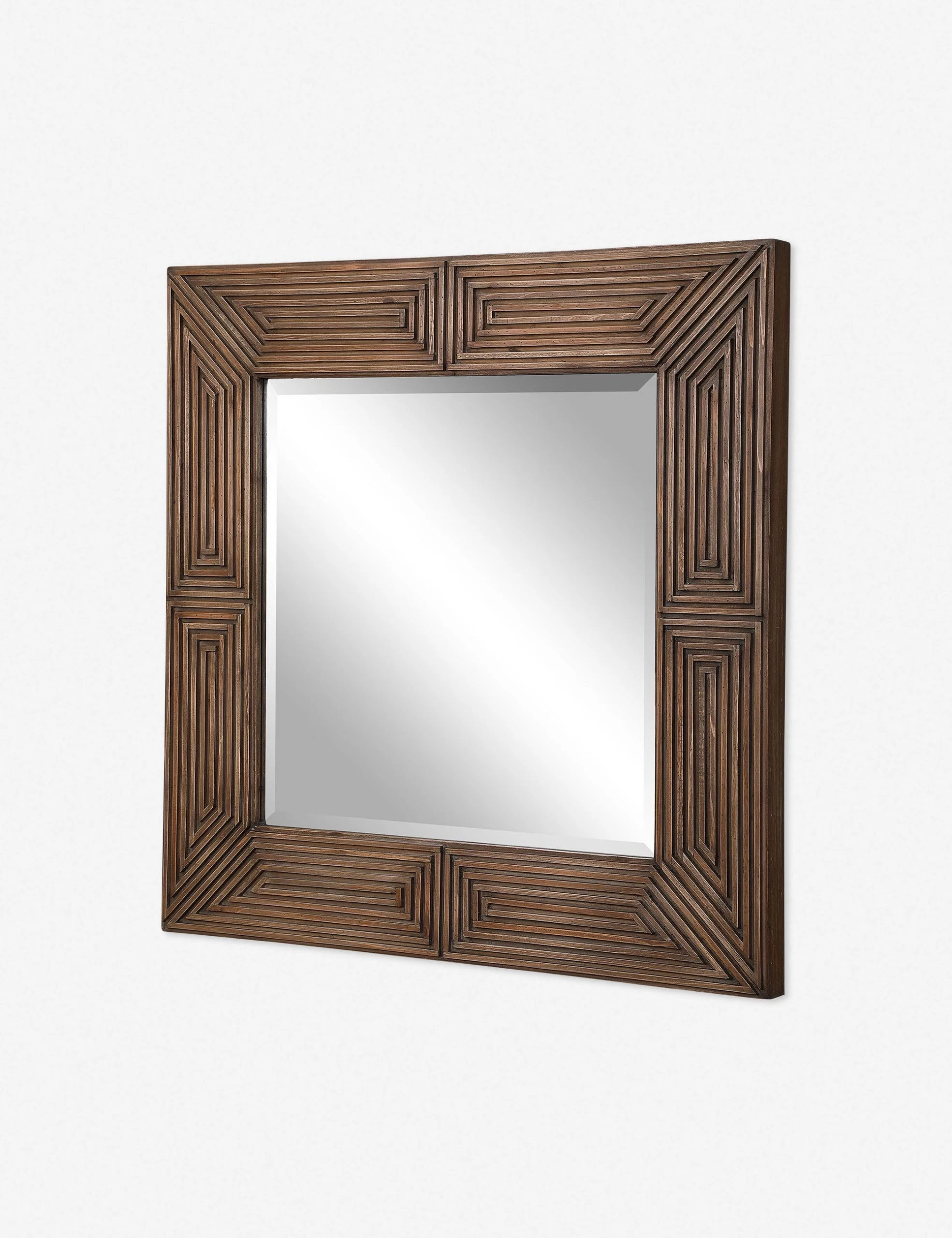 A hand-carved frame features an intricate geometric pattern complemented by an antique finish in this decorative wall mirror. This distinctive wood-framed mirror adds dimension and endless visual appeal to a moody look or collected aesthetic.