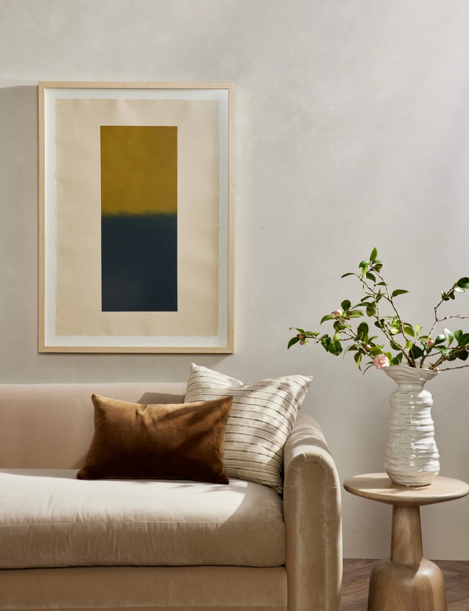 Visual Contrast is a Los Angeles-based fine art studio that produces limited-edition runs of high-quality wall art. A member of their artist collective crafts each by hand, creating unique and timeless works. A minimalist composition draws focus on color in this abstract wall artwork, inviting the viewer to contemplate how the hues affect each other as they blend.