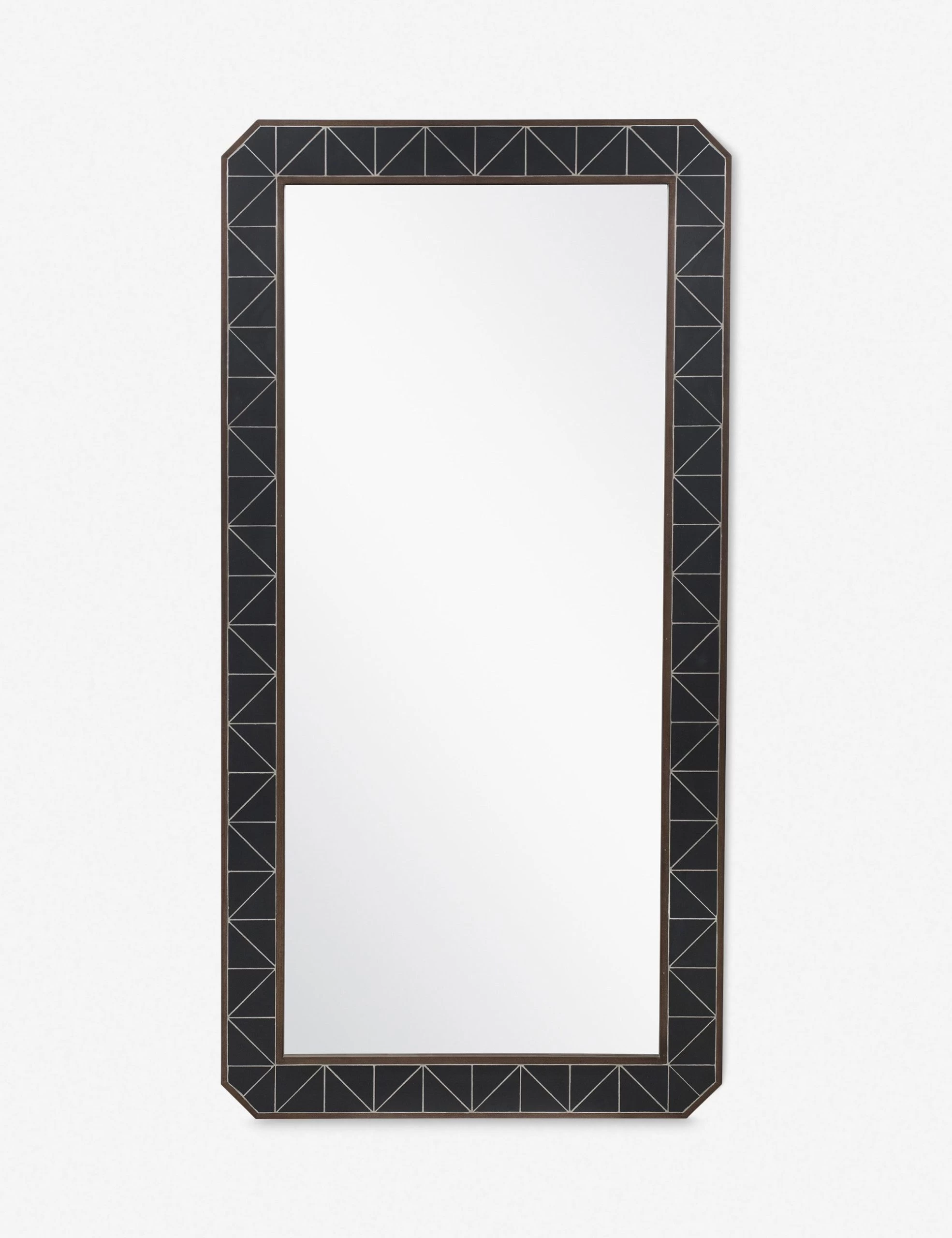 Black concrete tiles add geometric appeal to this poplar frame mirror. With architectural lines and unique construction, this large decorative mirror will lend your space with stunning new depth and dimension.