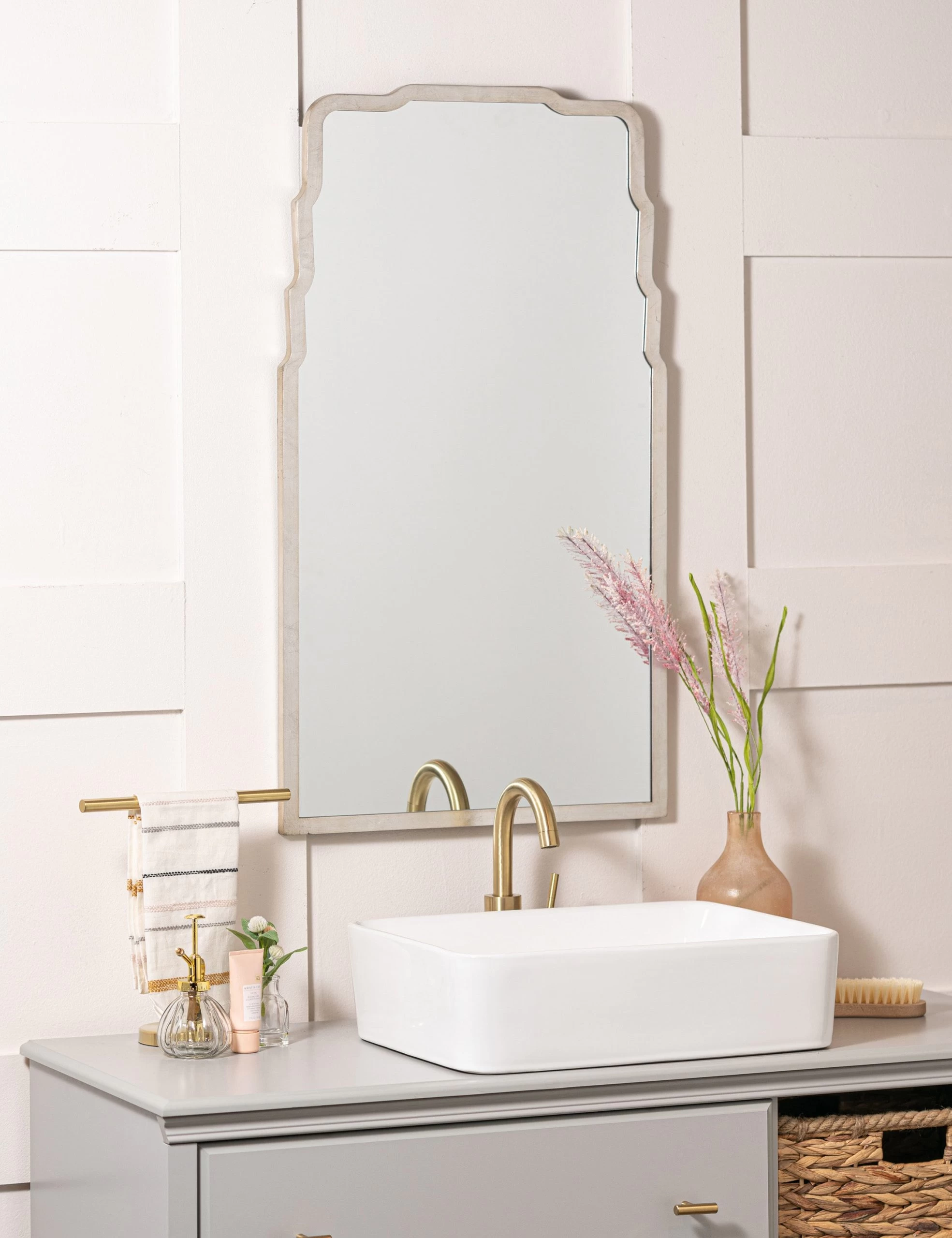 Bring a bright touch to your living space or bathroom with this distinctive mirror design. The dramatic profile features a subtly tiered top that sets this decorative mirror off with eye-catching appeal—finished with a lustrous frame tailored to your look.