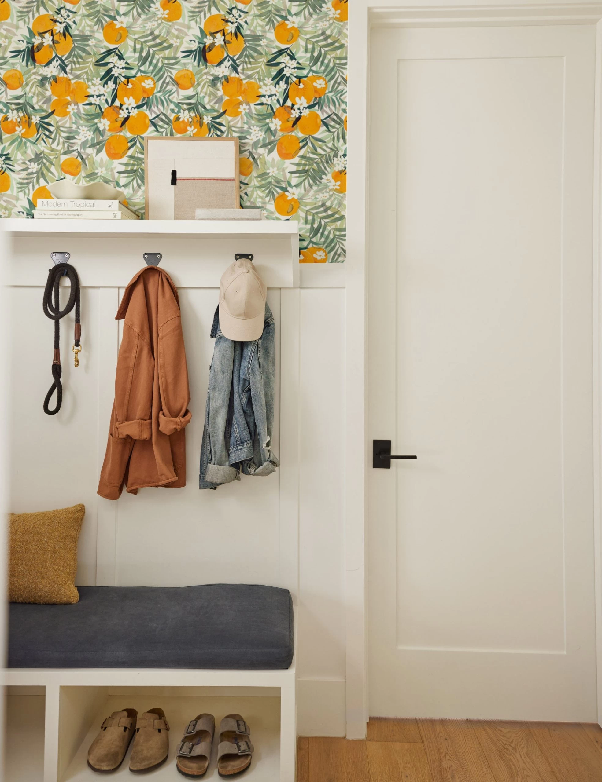 Soft watercolors of lacy leaves are the backdrop for the saturated blooms and pops of orange fruit in this statement-making removable wallpaper. Instantly transform your walls with peel + stick wallpaper—it’s easy to install and provides a mess- and residue-free removal.
