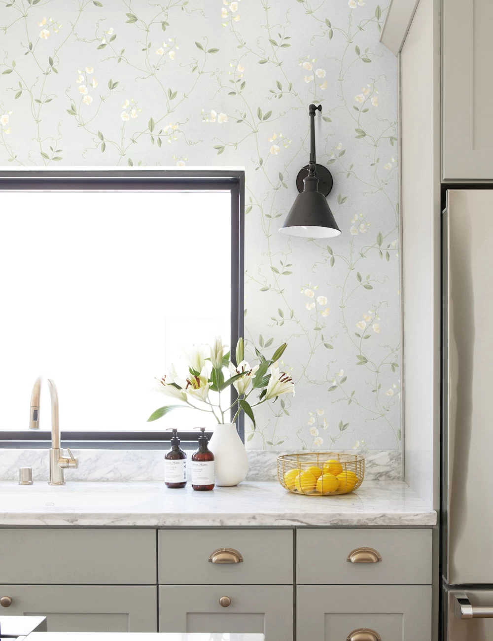Sweet pea blossoms compose a delicate motif, imbuing this home wallpaper ready with a soft appeal. This floral wallpaper can create a bright and elevating accent wall for a sunlit lounge or allover whimsy in a child’s bedroom.