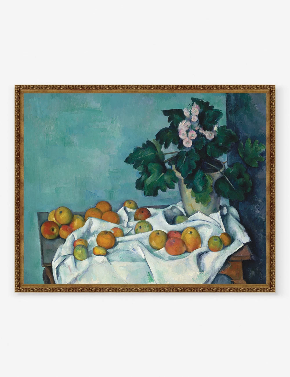 Soft, lush coloring fills the canvas with vibrant tones in this wall art painting by Paul Cézanne. Styled as a standalone piece or in an art wall collection, this timeless still life scene offers understated, high-art appeal. The original work is held by the Metropolitan Museum of Art.